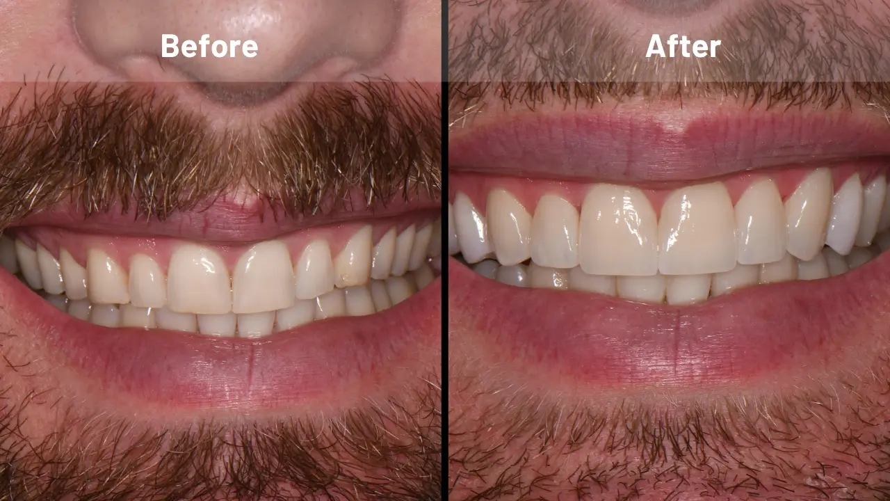 This patient wanted a more balanced smile, but years of recession made the front teeth look long and uneven. We designed four natural-looking porcelain veneers to improve shape, symmetry, and brightness, and partnered with our periodontist for gentle gum grafting to restore healthy tissue. Together, the veneers and gum grafting created a stronger foundation and a natural, confident result—showcasing how our Portland cosmetic dentistry team blends health and artistry in every smile makeover.